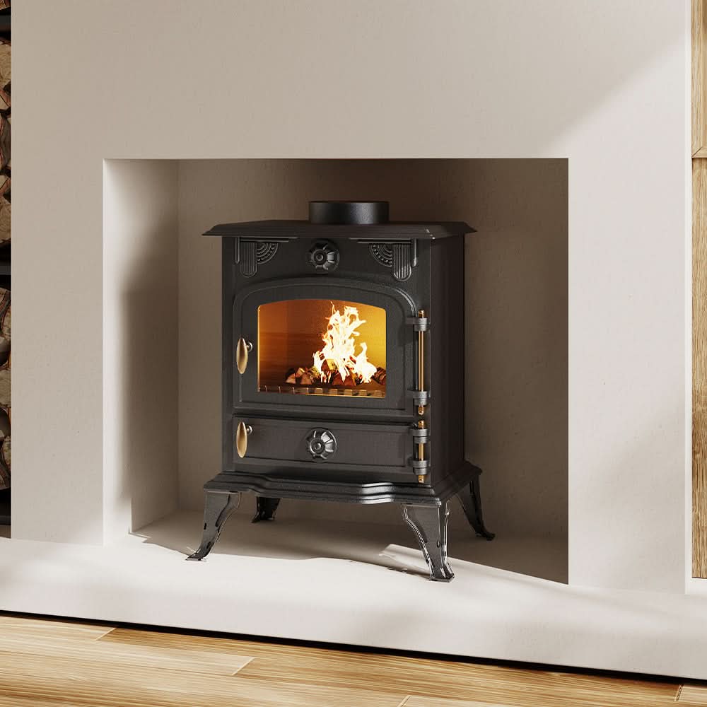 🔥【Safety-Certified & Eco-Conscious Design】: Compliant with CE & EN13240 standards, this stove features low emissions (0.10% CO) and strict safety clearances (700mm from back walls). Includes a 5” flue collar for secure installation—ideal for eco-minded homeowners seeking warmth and sustainability.